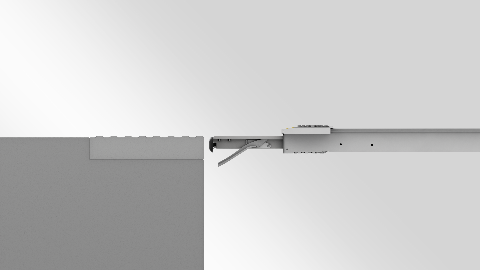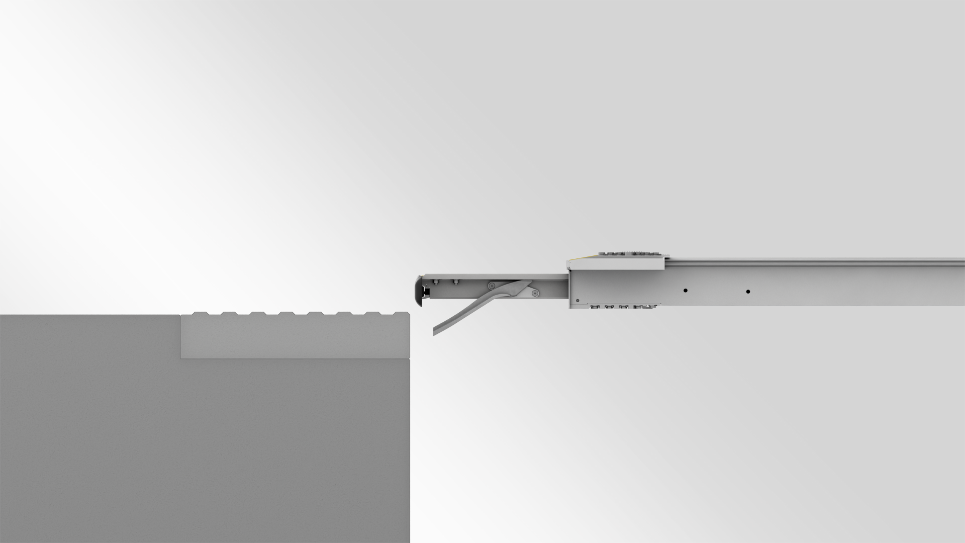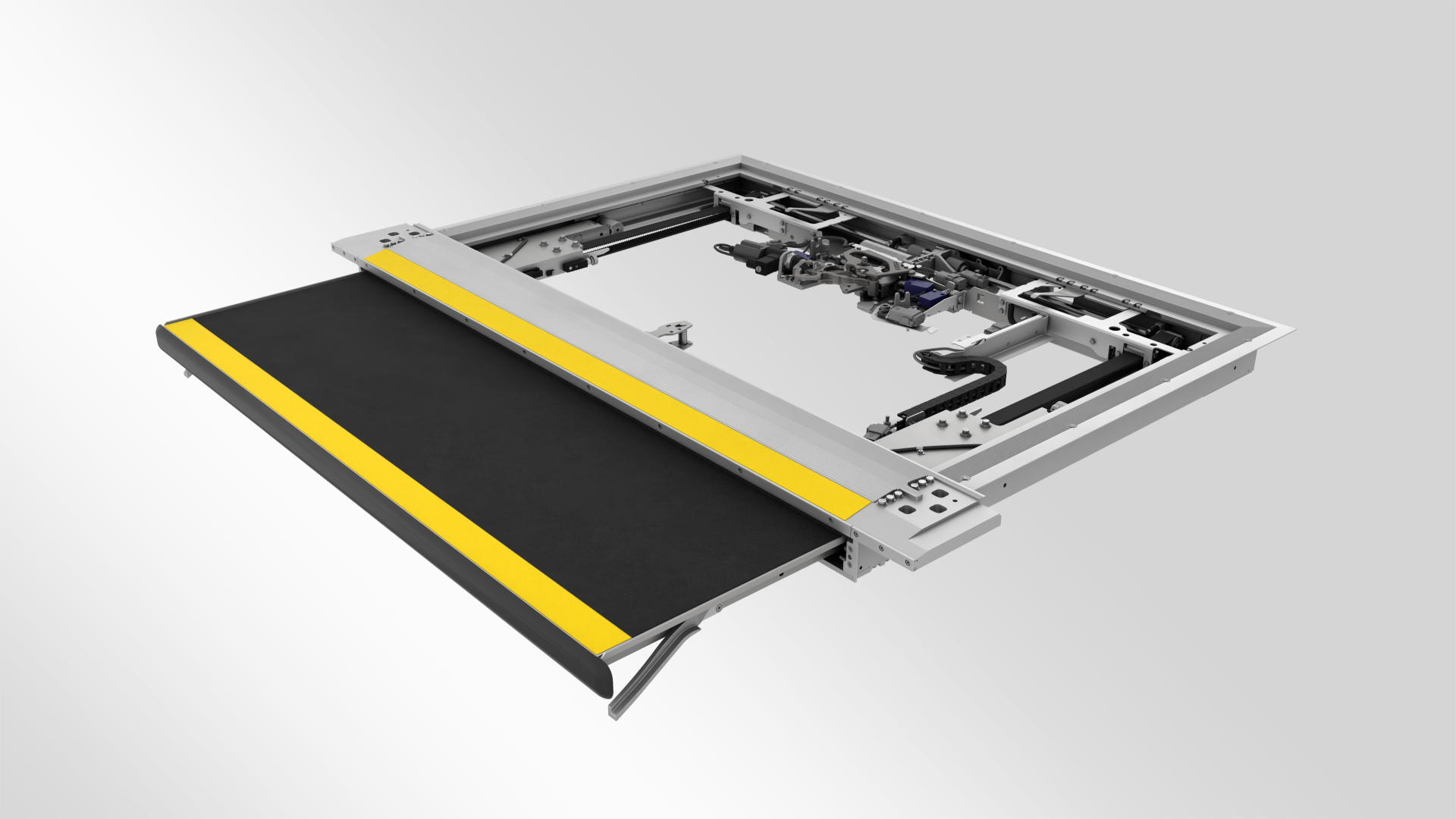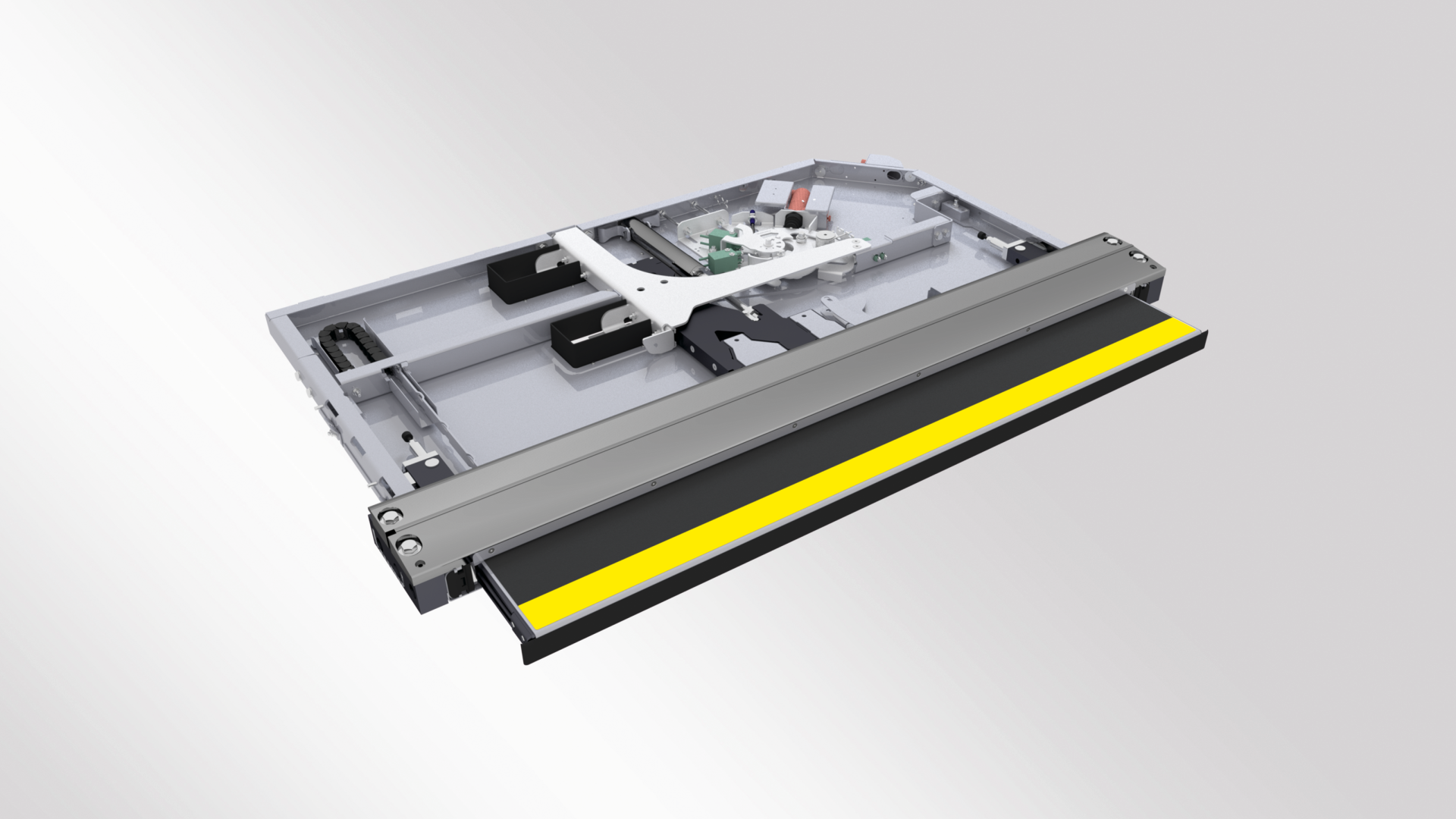 The STR Sliding Step is an innovative access system for rail vehicles that offers high flexibility and reliability. It features a clear width ranging from 900 to 1,800 mm and an extension range from 0 to 600 mm (standard: 360 mm). The design is particularly lightweight – for an application with a 1,300 mm cassette and a 360 mm extension range, the weight is only 65 kg. The installation height at the floor is reduced to 56 mm, and the opening and closing time is approximately 3.0 seconds (with a 300 mm extension path).